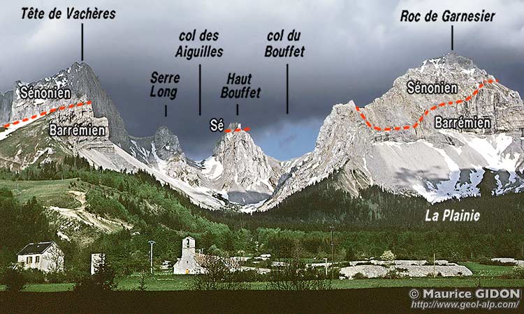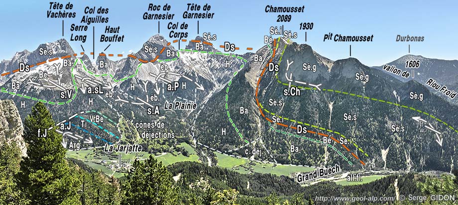 La rive gauche (sud-orientale) de la vallée du Grand Buëch, vue de l'ouest depuis le Pic de l'Aigle (cliché original obligeamment communiqué par Mr. S. Gidon). a.J = anticlinal de La Jarjatte (A2a) : il est tranché presque transversalement par la faille de la Jarjatte f.J ; s.V = synclinal de Vachères (S2a) ; a.SL = anticlinal du Serre Long (A2b) ; s.A =synclinal des Aiguilles (S2b) ; a.P = anticlinal de la Plainie (A3) ; s.Ch = synclinal N-S du Chamousset (rebroussement du flanc oriental du synclinal de Lus). En tirets rouges la surface de discordance* du Sénonien (Ds) ; Bé = calcaires bédouliens ; Sé.s = calcaires à silex lités, sénoniens ; Sé.g = calcaires gréseux et conglomératiques du Sénonien terminal. les sigles entre parenthèses sont ceux de la coupe N-S de la bordure ouest du Dévoluy. |