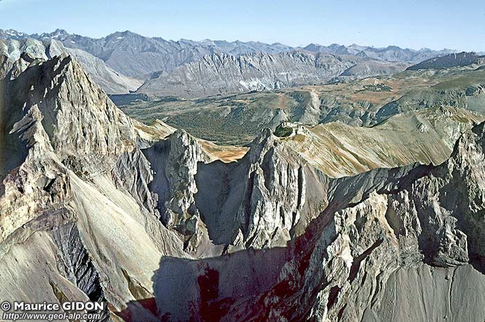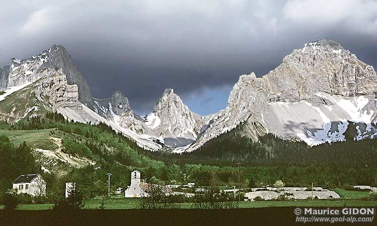 Ce groupe montagneux est assez profondément disséqué par l'érosion pour que les couches du substratum sur lequel le Sénonien repose en discordance* soient largement mises à nu, et ceci jusque au niveau des crêtes, tout particulièrement aux abords du col des Aiguilles. Ce substratum se montre énergiquement plissé, à la faveur du niveau des calcaires barrémo-bédouliens qui les dessinent clairement.