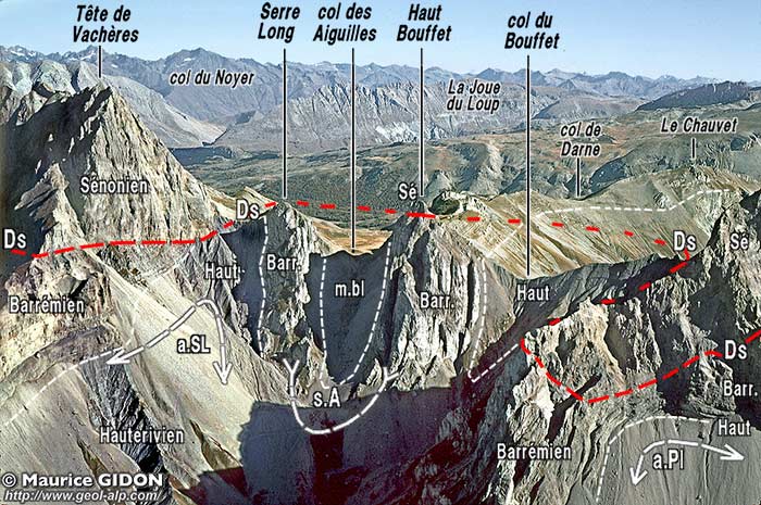 Le col et la crête des Aiguilles de Lus, vus de l'ouest, légèrement plongeante, prise d'avion. Ds = surface de discordance du Sénonien ; a.SL = anticlinal du Serre Long (A2b) ; sA = synclinal des Aiguilles (S2b) ; a.Pl. = anticlinal de la Plainie (A3 de la coupe N-S) les sigles entre parenthèses sont ceux de la coupe N-S de la bordure ouest du Dévoluy La barre calcaire du Barrémo-Bédoulien dessine splendidement les plis E-W anté-sénoniens (vus sensiblement selon leur axe), dont les voûtes anticlinales sont tranchées par Ds. |
