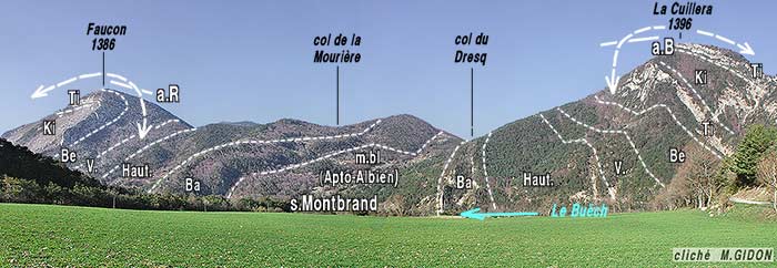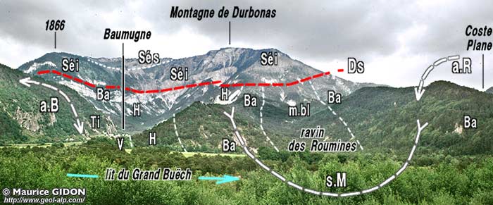a.R = anticlinal de La Rochette (A5), dont la voûte se ferme au sommet du Faucon ; a.B = anticlinal de Baumugne (A4). C'est par un effet de perspective