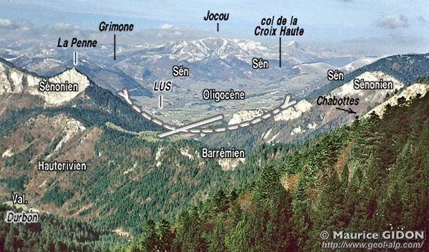 Sénonien (grossièrement en forme de crêt) qui s'enfonce vers le nord sous le remplissage tertiaire de la cuvette de Lus (cette dernière est visible à travers le col où passe l'axe synclinal).