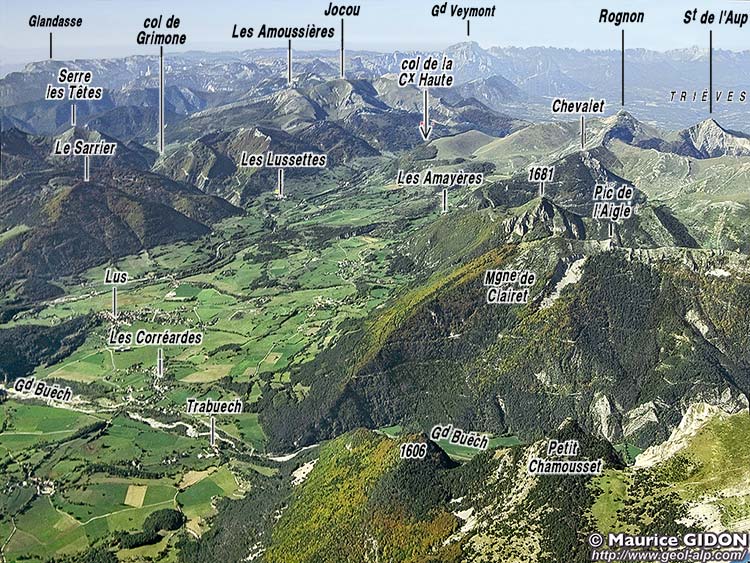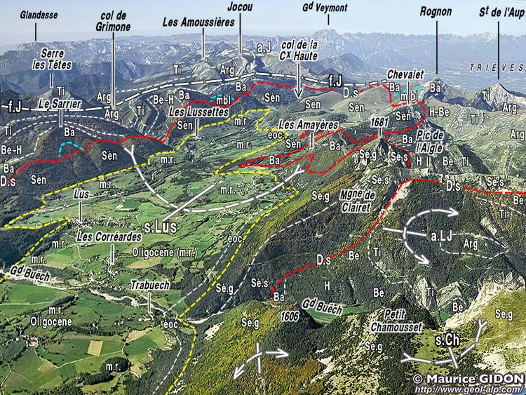 Cet "aplatissement" des voûtes anticlinales peut s'interpréter de deux façons : soit comme une disposition originelle correspondant à des plis coffrés*, soit comme le résultat d'un écrasement contre la dalle sénonienne lors du ploiement de cette dernière par la formation du synclinal le Lus. En fait il est bien possible que ces deux facteurs se soient additionnés. |