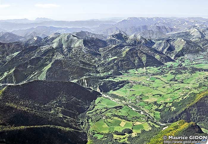 La bourgade de Lus est l'agglomération principale d'une ample dépression à fond presque plat qui s'étend vers le nord jusqu'aux abords du col de la Croix-Haute. Elle correspond structuralement à une cuvette synclinale, allongée N-S, dont le coeur de sables éocènes et surtout de Molasse Rouge oligocène, nettement plus tendre que les calcaires sénoniens de ses flancs, a été en partie évidé et presque aplani par l'érosion (c'est donc un "val"* très caractéristique).