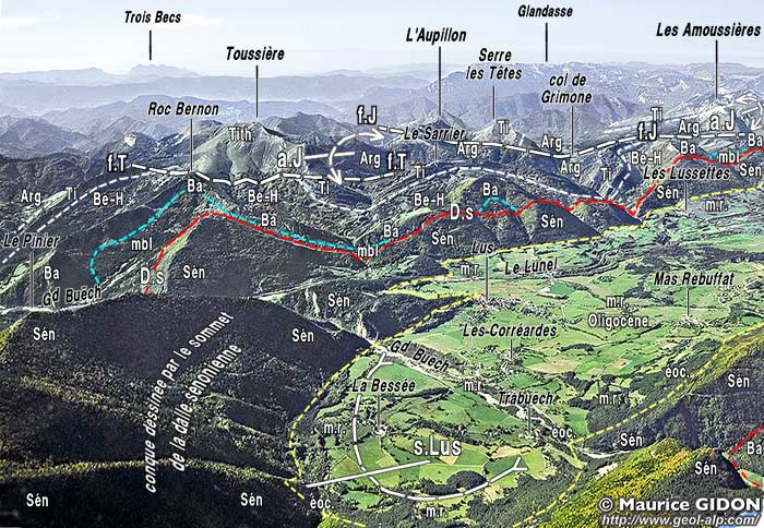 On repère surtout l'emplacement de ces anticlinaux par l'incurvation que dessine la barre tithonique. Mais en fait celle-ci consiste en deux charnières distinctes et assez distantes, l'une septentrionale l'autre méridionale ; entre les deux les couches tendent à se paralléliser à la surface de transgression du Sénonien, de sorte que la discordance angulaire à la vôute du pli est difficilement perceptible et sans point d'inversion localisable.