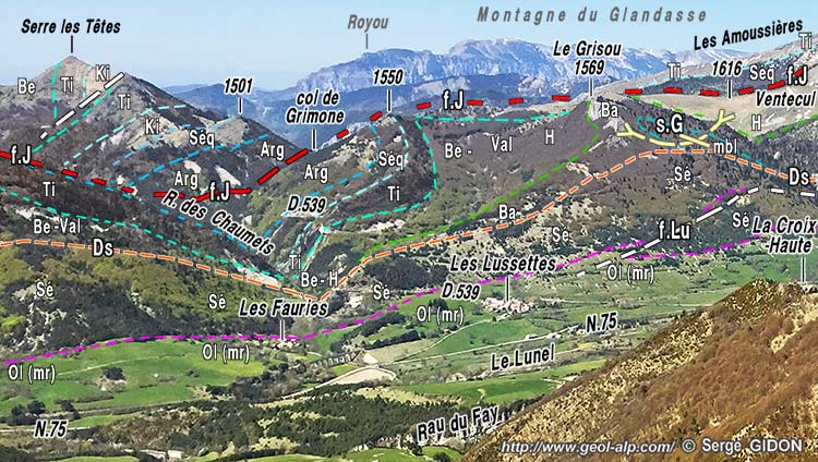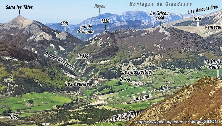 La partie la plus large de la cuvette de Lus, qui se situe à la latitude de cette localité, correspond à un ensellement* du grand synclinal de Lus : son axe, orienté N-NW - S-SE, s'élève en effet vers le nord, pour passer au dessus du Trièves, et vers le sud pour passer au dessus du vallon de Durbon. Ceci a pour effet, dans les deux cas, de faire réapparaître à l'affleurement les terrains anté-sénoniens (dans lesquels la structure synclinale N-S ne se distingue plus que difficilement car elle y interfère avec les plis E-W anté-sénoniens, plus énergiques et de ce fait beaucoup plus visibles).