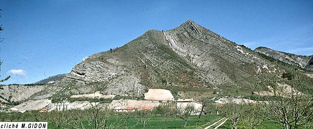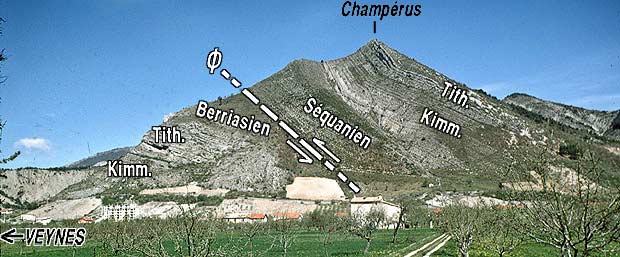 ![]() La butte de Champerus, vue du sud, depuis la plaine du Buëch Ø = chevauchement de Champerus |