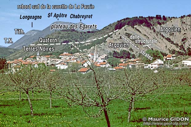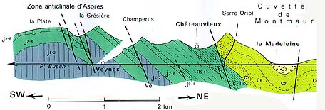 Ce dernier pli est d'ailleurs très ouvert et sa voûte s'enfonce ici vers l'est, car il y est repris par le flanc oriental de l'anticlinal NW-SE de La Plate. Cet entrecroisement de plis détermine une structure en dôme dont le coeur se situe plus à l'ouest, aux abords occidentaux d'Aspres, là où passe l'axe de l'anticlinal d'Aspremont, qui est le pli NW-SE majeur de l'anticlinorium* d'Aspres.