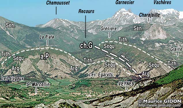 Le flanc oriental de l'anticlinal de la Plate est rompu par une cassure que l'on peut appeler chevauchement de La Grésière car elle surhausse sa lèvre orientale en un crêt tithonique N-S dont l'arête s'élève, vers le nord, jusqu'au sommet de ce nom. Au niveau de Veynes cet accident est pratiquement indiscernable car il passe au sein même des couches de l'Argovien. (voir des compléments dans la légende de la coupe en fin de page et à la page "Agnielles")