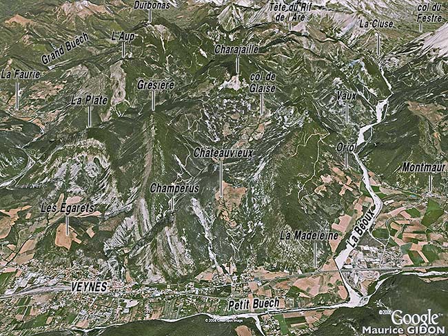 ![]() La vallée du Petit Buëch, en aval de Veynes, vue d'avion, du sud, de l'aplomb de Chabestan (cliché obligeamment communiqué par M. Thierry Dumont). Ds (en rouge-orangé) = surface de discordance du Sénonien ; tirets jaune-vert = surface de base de la terrasse mindélienne* des Égaux et des Egarets, dominant la vallée actuelle de plus de 150 m. a.As = anticlinal NE-SW d'Aspres ; a.At = disposition de l'anticlinal NNW-SSE d'Aspremont (plus à l'ouest que les limites du cliché) ; a.P = anticlinal N-S de la Plate, prolongement septentrional de celui de Villauret (sud de Saint-Auban d'Oze) (plus de détails à la page "La Faurie") . ØC = prolongement septentrional du chevauchement de Céüse |