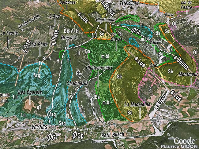 de celui de Villauret) (voir des détails complémentaires à la page La Faurie) ; ch.G = chevauchement de la Grésière