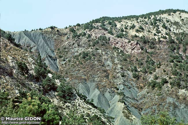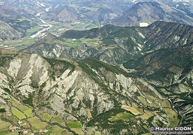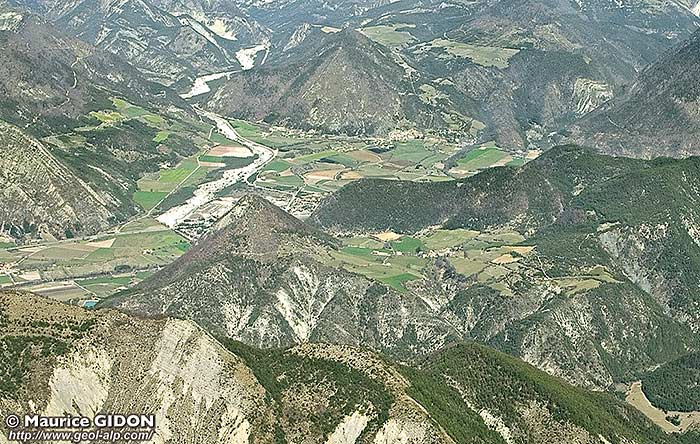 Ce changement d'orientation est visiblement lié au fait que toutes les couches de sa rive orientale prennent une telle direction, parallèle d'ailleurs à celle de la bande de Molasse Rouge oligocène (prolongement vers le sud des larges affleurements oligocènes de la cuvette de Montmaur) qui traverse les ravins affluents, E-W, de cette rive droite. Cette disposition des couches témoigne d'ailleurs de ce que ce versant de la vallée a été incorporé au flanc ouest du synclinal de Montmaur, lors des plissements N-S post-oligocènes.
