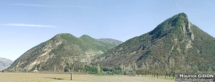 Un point remarquable est que, dans les panneaux délimités par ces cassures, l'orientation des couches se modifie, de l'ouest vers l'est, pour prendre à chaque fois un azimut de plus en plus proche de NNW-SSE. Ce pivotement azimutal a donné aux couches une orientation se rapprochant de celle des plans de cassure, mais surtout il les a disposé de façon parallèle à l'axe du synclinal du Villard de Montmaur. |