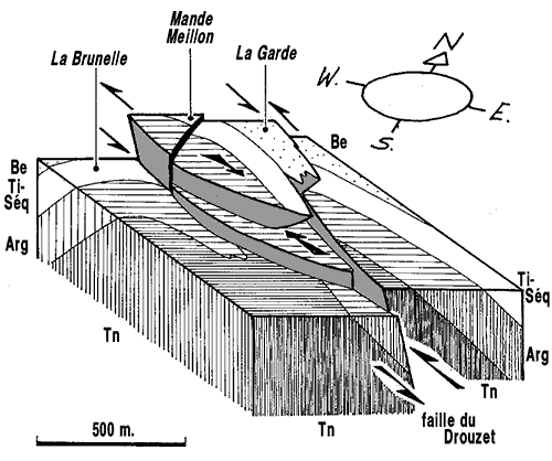 Bloc stéréogramme montrant l'agencement des fractures sub-méridiennes des abords de la vallée du Drouzet entre Châteauneuf d'Oze et Furmeyer. La faille du Drouzet se partage, vers le nord, en deux branches, isolant ainsi un bloc amygdalaire, relativement en saillie (petits sommets de Mande Meillon et de La Garde). Ce dernier s'avance en proue de bateau vers le sud, par rapport aux compartiments qui le flanquent à l'ouest et à l'est. Dans ce bloc intercalaire, et encore plus dans celui situé plus à l'est, on observe que le pendage des couches est ré-orienté selon un azimut très proche de celui des cassures. |