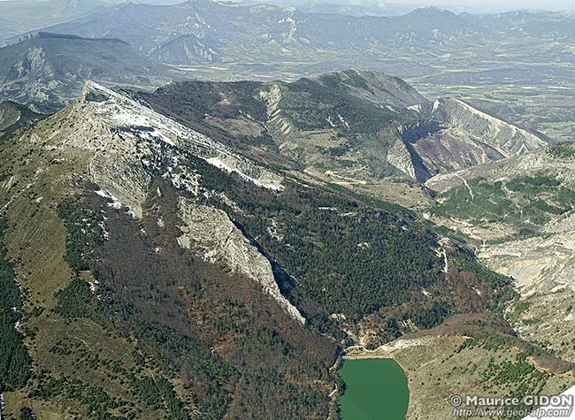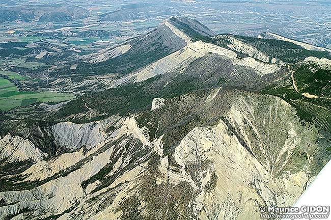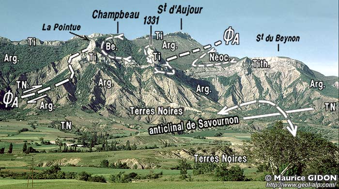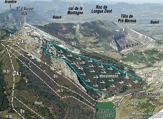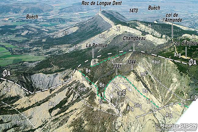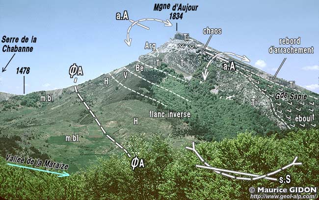 ![]() Le versant oriental de la montagne d'Aujour vu du sud-est, d'avion depuis l'aplomb de Peyssier. ØA1 = chevauchement d'Aujour (branche secondaire) ; ØA2 = chevauchement d'Aujour (branche principale) ; a.A = anticlinal d'Aujour ; f.P = faille des Priourets (voir la page "Maraize") |