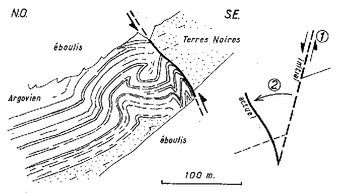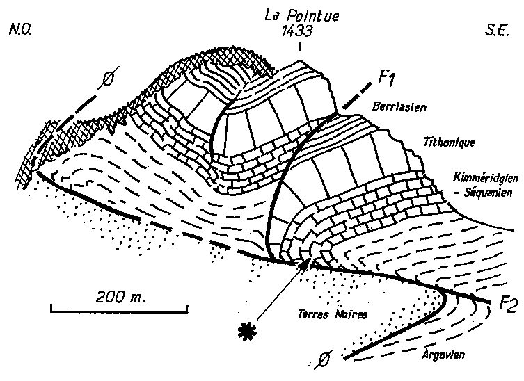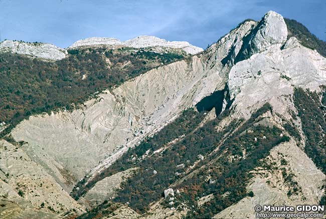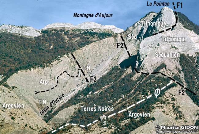 ![]() Coupe de la Montagne d'Aujour conforme à la vue que l'on en a sur le versant ouest (depuis Savournon). Le cadre localise les accidents de La Pointue et le cercle ceux du sommet du ravin d'Ouzère. |