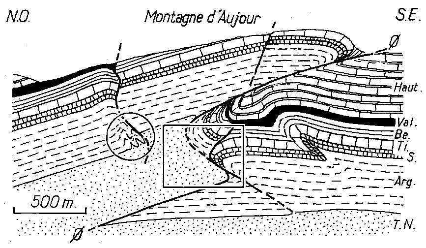 Les ravins du versant sud-ouest de la montagne d'Aujour offrent de belles entailles naturelles, qui montrent des détails structuraux curieux.