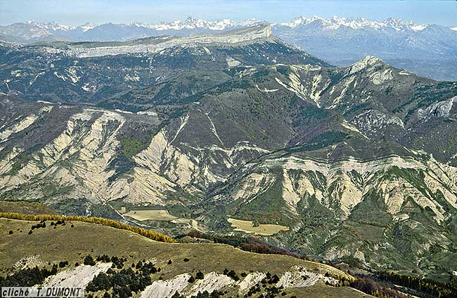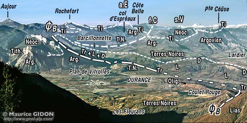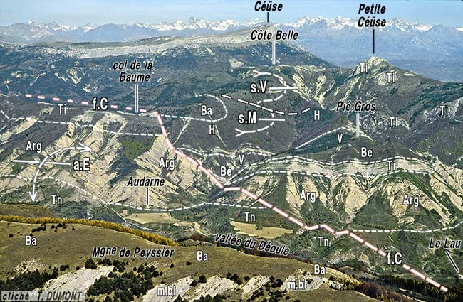 ![]() Les crêtes de rive gauche de la vallée de Barcillonnette vues d'avion, du sud-ouest, de l'aplomb de la crête des Selles (cliché original aimablement communiqué par Thierry Dumont). Ce cliché a surtout l'intérêt de montrer comment se prolonge, à la latitude de Barcillonnette, la grande faille de Châtillon-le-Désert (f.C). Son rejet vertical est encore important dans le Tithonique mais il devient de plus en plus difficile à apprécier en descendant dans la succession des couches de l'Argovien et n'atteint plus qu'une cinquantaine de mètres au niveau du Lias de Vitrolles (loin à droite de la limite du cliché). a.E = anticlinal N-S d'Espréaux ; s.M = synclinal N-S de Montmaur ; s.V = synclinal N-S du Villard de Montmaur. Se reporter à la page "Petite Céüse" pour l'analyse des détails structuraux de ce sommet. En arrière la corniche de Céüse est surhaussée par le chevauchement de Céüse-La Saulce (masqué derrière la crête Côte-Belle - Petite Céüse) et domine ainsi la Petite Céüse. |