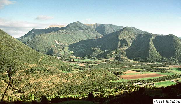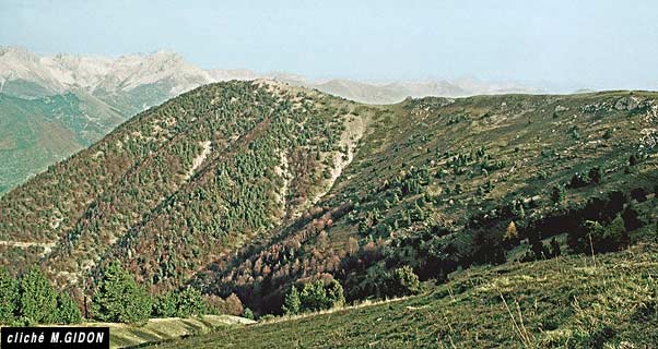 La cuvette d'alpages de la montagne de Céüse est limitée du côté ouest par la corniche tithonique du flanc occidental du synclinal de Céüse-Matacharre (crête de La Barre et de La Manche). Les pentes de cette dernière couronnent celles de rive droite du Drouzet (voir la page "Châtillon"). Plus au nord, entre ces hautes pentes dénudées et la dépression de Montmaur, se développe un système de crêtes boisées qui s'abaissent jusqu'à la vallée du Buëch, depuis les abords de Manteyer à l'est jusqu'au Villard-de-Montmaur et auxs abords de Furmeyer à l'ouest.