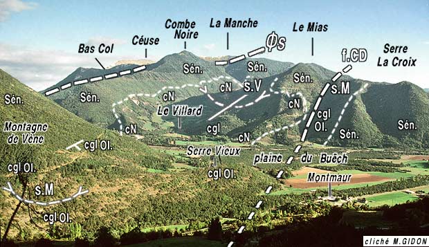 Ce système de plis méridiens post-nummulitiques est en outre traversé longitudinalement par une importante cassure N-S, la faille de Châtillon le Désert. À l'ouest de cette faille affleurent les molasses et les conglomérats tertiaires, qui prolongent ceux qui, au nord du Buëch, affleurent au coeur du synclinal de Montmaur proprement dit. Mais au sud de la rivière ces affleurements ne forment qu'une bande relativement étroite, à l'intérieur de laquelle les couches oligocènes sont seulement modérément inclinées vers l'est.