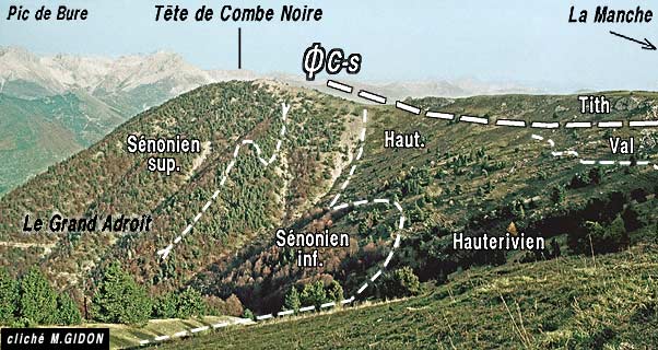- Le versant occidental de la crête de la Tête de Combe Noire est formé juqu'assez bas par les niveaux supérieurs des couches calcaires du Sénonien. Elles y sont pentées un peu plus fortement que le versant, de sorte qu'avant le pied de celui-ci (qui correspond au fond du vallon du Villard-de-Montmaur) elles disparaissent sous la barre, ici peu saillante d'ailleurs, des calcaires nummulitiques. Ce vallon est une combe ouverte dans les marno-calcaires nummulitiques du coeur du synclinal du Villard-de-Montmaur. Leurs affleurements occupent une large place vers le bas mais leur largeur se réduit progressivement vers le haut en direction de la crête des Fays (voir la page "Châtillon") : ceci est simplement dû à ce que l'axe du synclinal plonge plus fortement vers le nord que le lit du ravin qui draine le vallon.