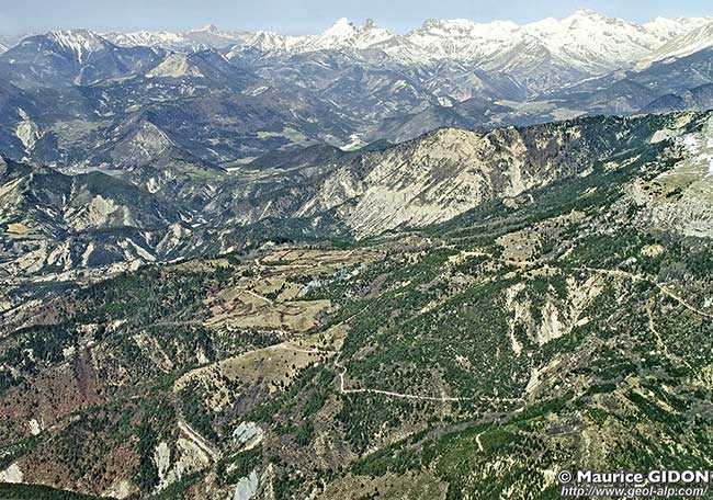 - à l'est affleurent des marnes bleues apto-albiennes, sur lesquelles sont installées les prairies envahies de broussailles qui garnissent le replat et, sur une certaine distance, les pentes en amont. Elles sont ployées en un ample pli N-S qui est le prolongement méridional, dans ces couches peu résistantes à l'érosion, du synclinal du Villard-de-Montmaur.