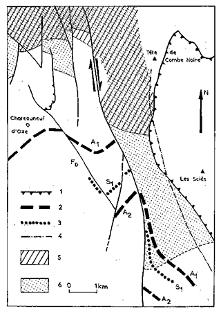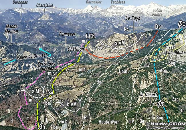 Données complémentaires sur la faille de Châtillon-le-Désert : Cette importante cassure apparaît dans les pentes qui ferment la cuvette de Montmaur du côté sud et l'on ne connaît pas avec certitude son prolongement du côté nord de cette dépression alluviale. Elle court à flanc des pente de la rive orientale du torrent du Drouzet jusqu'à l'ouest du col des Guérins où elle passe sur sa rive occidentale puis franchit la crête qui la sépare de la vallée de Barcillonnette. Elle traverse alors cette dernière obliquement et se raccorde à l'extrémité septentrionale du chevauchement de Barcillonnette. Enfin cette cassure semble avoir fonctionné dès le Nummulitique et avoir eu alors un rôle paléogéographique en constituant la frontière entre le domaine des molasses rouges continentales, à l'ouest, et celui des faciès marins (Grès du Champsaur, de type flysch*), à l'est.