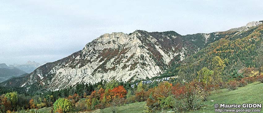 L'emplacement du chevauchement de Céüse - La Saulce s'y repère par le passage brutal, du bas vers le haut, aux marno-calcaires de l'Argovien qui ceinturent le pied de l'abrupt tithonique. Mais ce contact est souvent masqué par des éboulis, parfois riches en très gros blocs, qui témoignent de ce que ce versant a été sujet à des éboulements à plusieurs reprises.