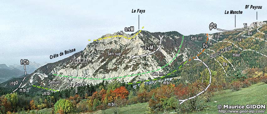 On y voit se succéder tous les termes antérieurs aux marnes bleues, jusqu'au Berriasien inclus. Mais le Tithonique de ce flanc du pli n'est représenté que par quelques pointements isolés, dont le plus important et le plus septentrional est le rocher du Peyron. Cela semble dû pour une part à un laminage tectonique sous le chevauchement de Céüse, mais cela résulte apparemment aussi d'un amincissement stratigraphique, allant jusqu'à une lacune locale de ce niveau ; ceci est notamment observable sur la route forestière au nord du col des Guérins en contrebas des ruines de l'ancien hameau du Désert : cette lacune est comparableà celle connue plus au nord-ouest, dans la basse vallée du Drouzet, à Côte-Mare, et a sans doute une origine analogue, par érosion sous-marine. |