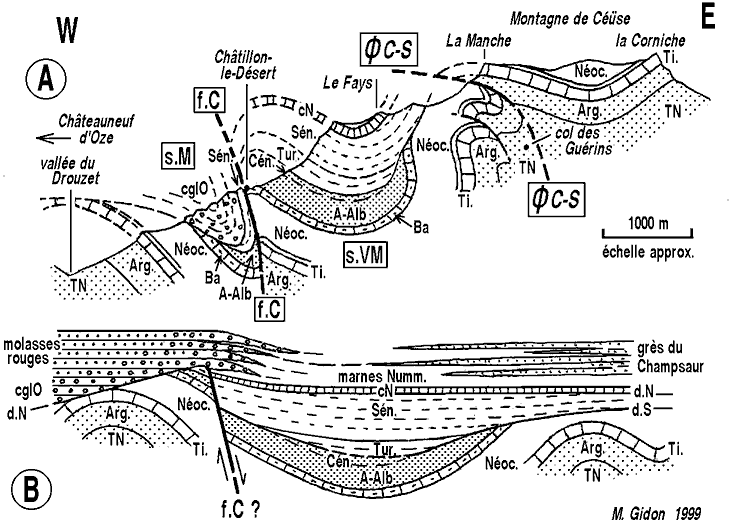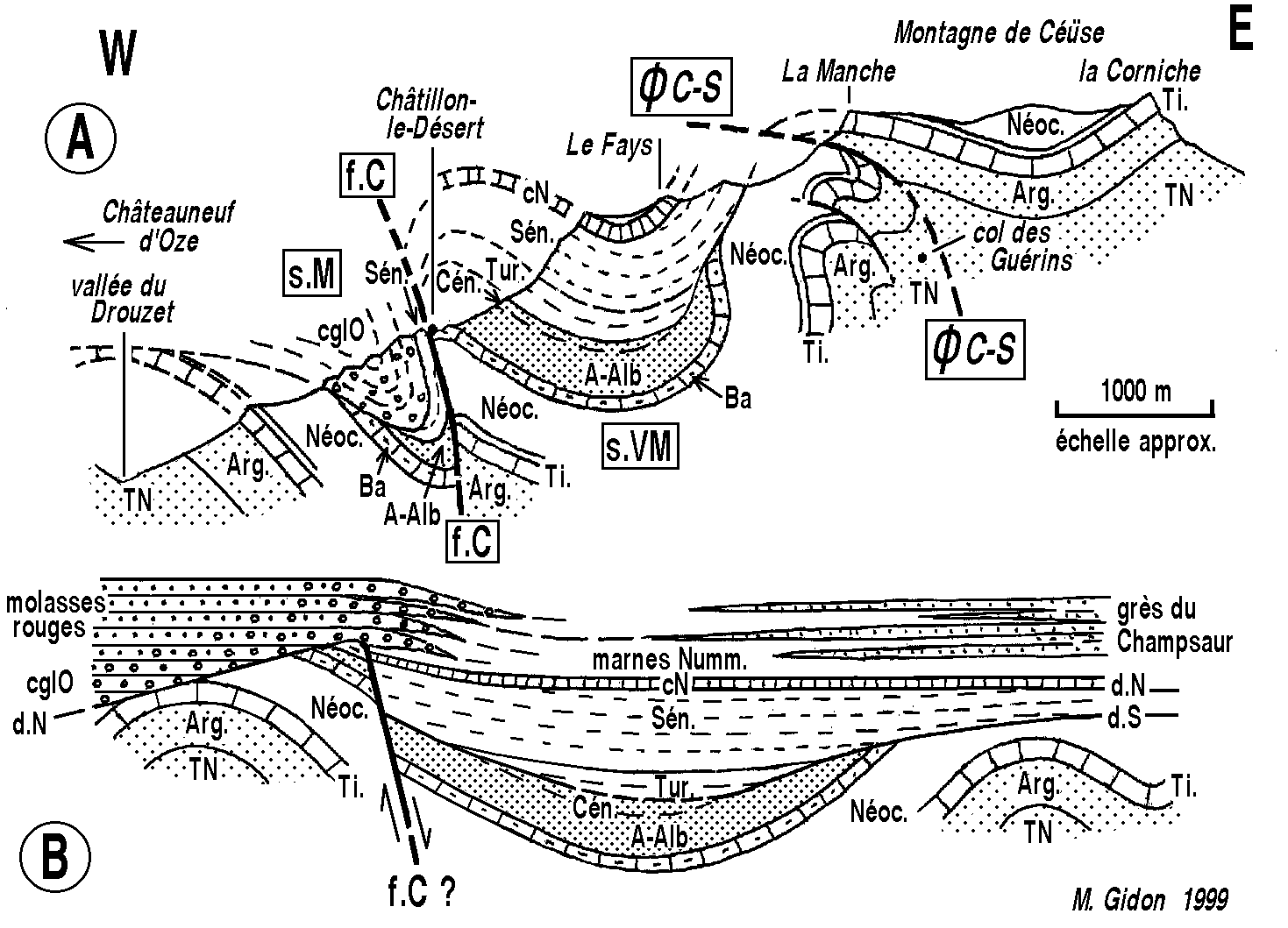 s.M = synclinal de Montmaur ; f.C = faille de Châtillon-le-Désert ; s.VM = synclinal du Villard de Montmaur ; ØC-S = chevauchement de Céüse - La Saulce. cglO = Molasse Rouge oligocène riche en conglomérats. Il est vraisemblable que la faille de Châtillon-le-Désert avait alors fonctionné en extension, avec une composante de soulèvement de son compartiment occidental, car la surface de discordance du Nummulitique (d.N) y coupe des terrains plus anciens que dans le compartiment oriental. Cette faille coïncide donc (au moins grossièrement) avec la frontière paléogéographique entre le domaine du Nummulitique continental (molasses rouges, à l'ouest) et celui du Nummulitique marin (Grès du Champsaur, de type flysch*, à l'est) N.B. : Les plis visibles sous la discordance du Sénonien (d.S) sont en réalité obliques à la coupe (car leurs axes sont orientés NE-SW). |