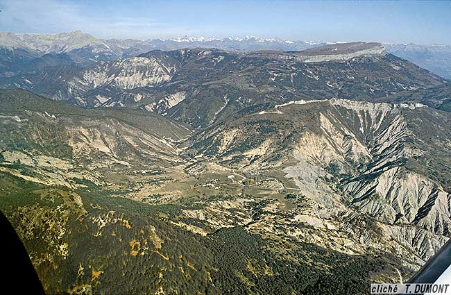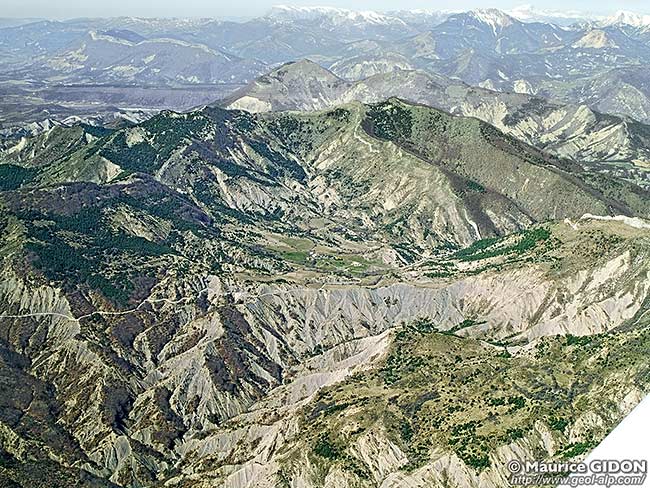 Les ravines de sources du Déoule et la vallée de Barcillonnette vues d'amont, du nord-ouest, depuis le Col d'Espréaux |