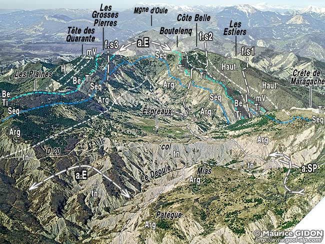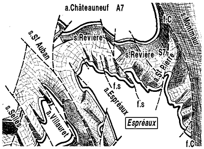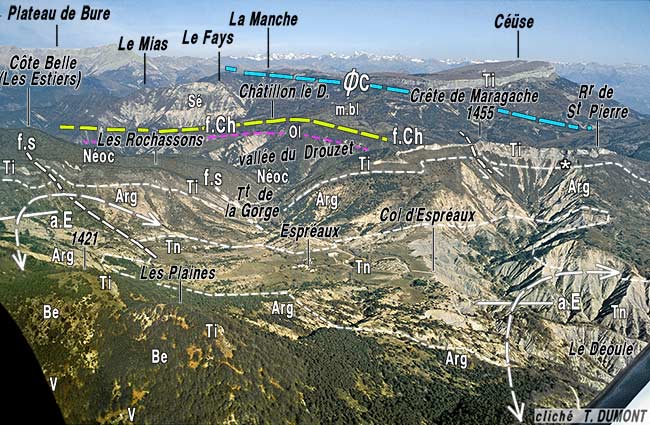 (vue zénitale, comparable à une vue de satellite). En blanc le coeur (de Terres Noires) des anticlinaux éventrés par l'érosion. f.s = failles secondaires du flanc NE de l'anticlinal d'Espréaux ; f.C = faille de Châtillon le Désert . |