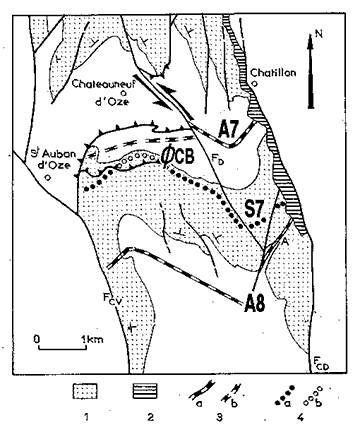 Schéma structural des alentours méridionaux de Châteauneuf-d'Oze.1, Affleurements crétacés; 2, Affleurements oligocènes; 3, Axes anticlinaux (a, visibles; b, masqués en surface); 4, Axes synclinaux (a, visibles; b, masqués en surface). A7, Anticlinal de Châteauneuf-d'Oze ; A8 = Anticlinal du Rocher de Saint-Pierre ; S7 = Synclinal de La Revière et du ravin d'Espinasse ; F CV= Faille du col de Villauret ; F D =Faille du Drouzet ; F CD = Faille de Châtillon-le-Désert. |