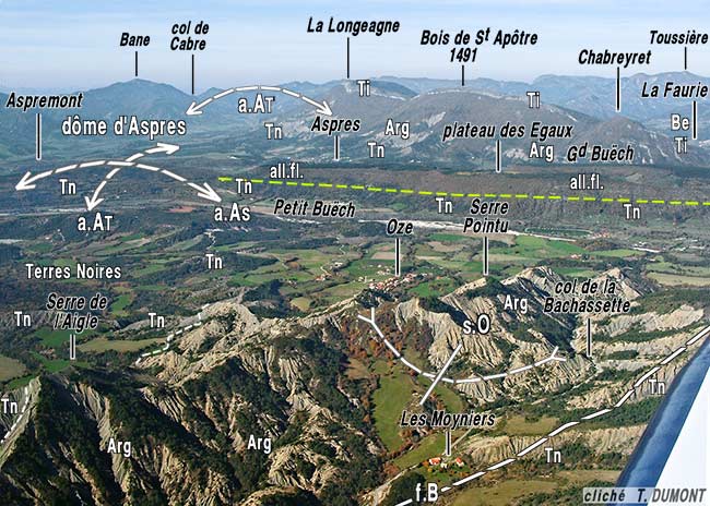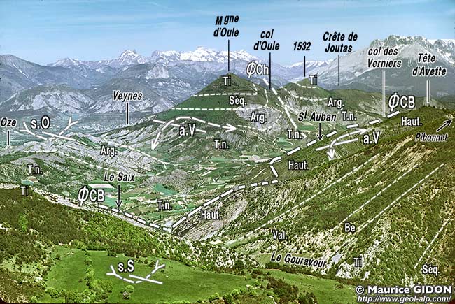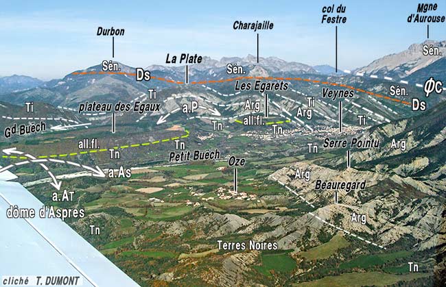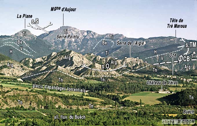 ![]() Les montagnes de rive gauche du Petit Buëch, en aval de Veynes En premier plan, la plaine alluviale actuelle du Buëch est occupée par des vergers, comme une grande partie de la plaine de la Durance plus en aval. En plan intermédiaire, les reliefs de "bad-lands" (ciselés de "roubines") dans l'Argovien (sommet des Terres Noires) du Serre de l'Aigle. En arrière-plan, la montagne d'Aujour est formée par une dalle structurale* de Tithonique, inclinée vers l'observateur. Elle plonge sous les Terres Noires, dont elle est essentiellement séparée par le chevauchement de Côte Belle - Le Saix (ØCB, à tracé E-W et vergence vers le sud (vers l'arrière de la vue), qui surhausse les marnes jurassiques du premier plan. s.TM = synclinal E-W de Tré Maroua (s7 de la carte schématique) ; s.O = synclinal N-S d'Oze. |