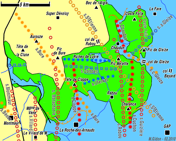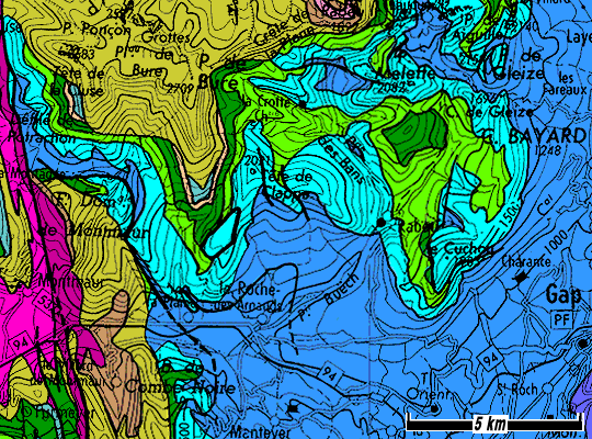 Il est à signaler que, dans le versant ouest de la montagne de Charance, le tracé du chevauchement de Charance, bien visible sur le versant gapençais de la crête, se suit encore dans les pentes au sud du village de Rabou. Mais il se perd, plus au nord, au niveau des marnes valanginiennes (largement recouvertes d'éboulis) des abords du coeur du synclinal de Saint-Étienne (abords du village de La Rivière) : on ne sait donc pas comment ce chevauchement s'amortit ou se prolonge en profondeur |