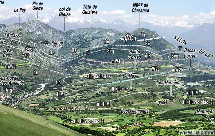 ![]() La montagne de Charance et la vallée de Rabou vues de Céüse (crête de La Manche) ØCh = chevauchement de Charance ; glR = hauts dépôts morainiques, attribués au Rissien ; mW1, mW2a, mW2b = moraines des stades de retrait 1 et 2 du glacier wurmien provenant du sillon de Gap ; éc.W2 = chenal d'écoulement marginal des eaux de fonte au stade de retrait n°2 ; all.fl.M = alluvions fluviatiles anciennes (Mindel ?), recouvertes par les alluvions glaciaires wurmiennes. (concernant la montagne de Charance on trouvera des commentaires plus détaillés à la page "Charance" de la section Gap-Digne ; concernant les pentes de Corréo voir la page "La Roche des Arnauds") |