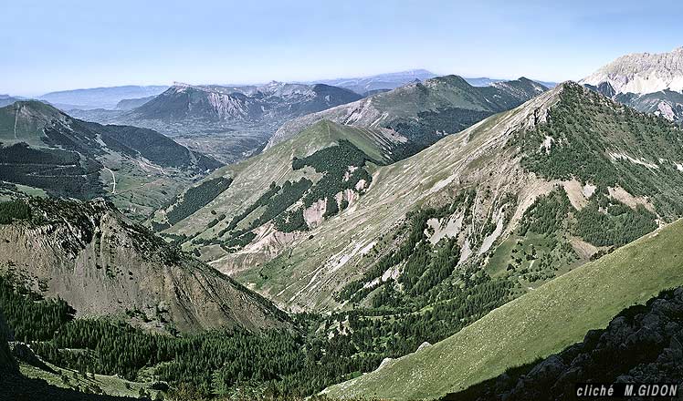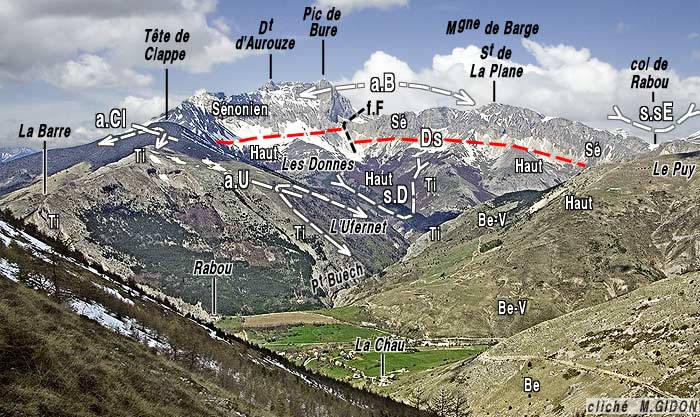 Au delà du crêt de Charance, en effet, le soulèvement du Dôme de Remollon a occasionné l'ablation des couches à prédominance calcaire du Crétacé et du Jurassique terminal qui formaient originellement la voûte de cette vaste coupole anticlinale et a mis à nu les couches du Jurassique moyen et inférieur, qui sont cachées en profondeur à Rabou comme dans tout le massif du Dévoluy. |