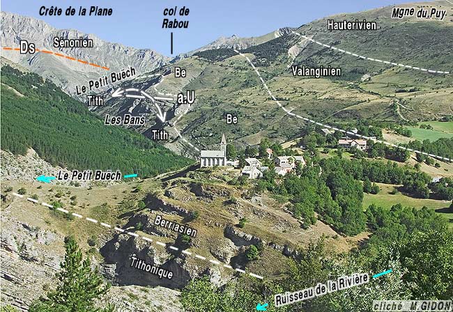 Du côté nord du village le cours du Petit Buëch, en provenance du nord depuis le pied des abrupts du Pic de Bure (voir la page "Rabou nord"), coupe transversalement les plis E-W successifs, à commencer par la gorge de l'Ufernet qui tranche l'anticlinal du même nom.