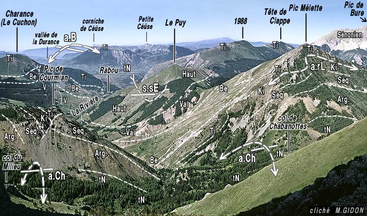 ![]() La crête de la montagne de Charance (rive sud du ruisseau de La Rivière) vue du nord-est, depuis l'échine sud du Pic de Gleize (point coté 1996) (cliché obligeamment communiqué par M. François Longeot). s.sE = synclinal de Saint-Étienne : son axe, perpendiculaire au tracé du vallon qui monte de Rabou au col de Gleize, plonge en outre vers le nord, comme tous les plis N-S de ce secteur, situé sur la périphérie septentrionale du Dôme de Remollon (voir la page "structure du Gapençais"). ØCh = chevauchement de Charance ; a.B = prolongement méridional de l'anticlinal de Bure. |