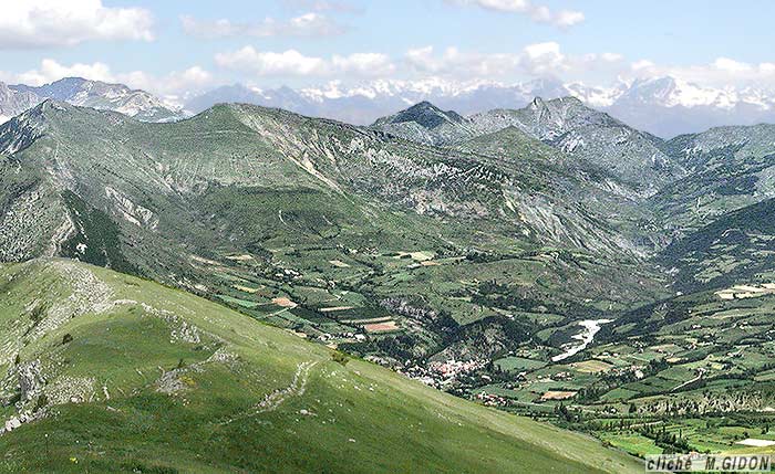 Le versant nord de la plaine du Buëch, à la différence de son versant sud, s'élève en pente douce sur un soubassement de Terres Noires que domine la corniche tithonique. Ce talus résulte de l'affouillement des marnes du coeur de ce pli par les langues glaciaires diffluentes, au cours des différentes glaciations (jusqu'au stade 2 du Würm, le stade 3 n'ayant pas dépassé le seuil de la Freissinouse). De part et d'autre de l'entaille du torrent se manifestent cependant quelques dissemblances.