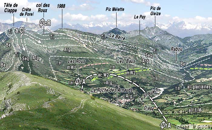 ![]() La montagne de Clappe et La Roche des Arnauds vues de Céüse (crête de La Manche) aCl = anticlinal de Clappe (pour simplifier le dessin on a omis de représenter la cassure de chevauchement qui affecte ce pli à doite du sommet) ; ØcR = chevauchement du col des Roux ; ØrA = chevauchement de la Roche-des-Arnauds. mW1, mW2 = moraines des stades de retrait 1 et 2 du glacier wurmien ; éc.W2 = chenal d'écoulement marginal des eaux de fonte au stade de retrait n°2 ; all.fl.M = alluvions fluviatiles anciennes (Mindel ?), recouvertes par les alluvions glaciaires wurmiennes. La suite de ce paysage vers la gauche est représentée à la page "Matacharre". |