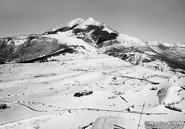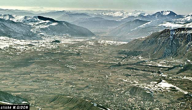 b) Du côté oriental, qui correspond aux pentes descendant depuis les villages de Corréo, le bedrock reste entièrement caché sous les alluvions quaternaires. Le versant s'élève jusqu'au pied de la barre tithonique qui ceinture l'extrémité méridionale de la montagne de Charance par des ressauts successifs.; ce sont en fait les marques de cordons morainiques, inclinés vers l'ouest, qui témoignent des positions successives atteintes, lors de la fonte du glacier durancien, par le bord nord de la langue de glace qui s'écoulait vers l'ouest.
