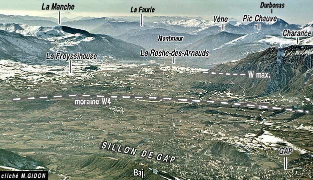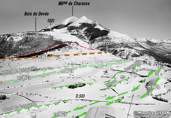 ![]() La montagne de Charance et la vallée de Rabou vues de Céüse (crête de La Manche) ØCh = chevauchement de Charance ; glR = hauts dépôts morainiques, attribués au Rissien ; mW1, mW2a, mW2b = moraines des stades de retrait 1 et 2 du glacier wurmien provenant du sillon de Gap ; all.fl.M = alluvions fluviatiles anciennes (Mindel ?), recouvertes par les alluvions glaciaires wurmiennes. (concernant la montagne de Charance on trouvera des commentaires plus détaillés à la page "Charance") |
