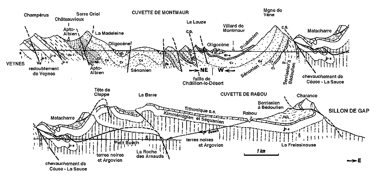 ![]() Coupe de Montmaur à la Roche-des-Arnauds (marge occidentale du massif de Rabou) = Coupe naturelle fournie par la rive nord de la vallée du Petit Buëch. Le "chevauchement de Céüse - La Saulce" est le nom donné, au sud du Buëch au prolongement méridional du chevauchement médian du Dévoluy. Contrairement à ce qui avait été admis dans les publications anciennes de l'auteur, notamment sur la carte Gap au 1/50.000°, son tracé traverse la plaine alluviale plus à l'ouest que la Roche-des-Arnauds, au niveau des Mourens.. Il s'avère être bien distinct du chevauchement de la Roche-des-Arnauds, dont le pendage est plus faible et ondule d'une façon qui atteste de ce que ce chevauchement a été déformé par les plis d'axe N-S que dont l'anticlinal de Matacharre et le synclinal de Clappe |