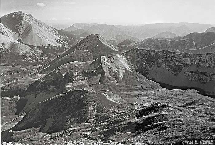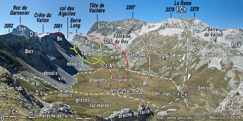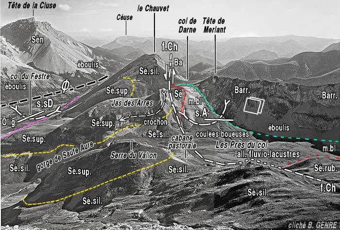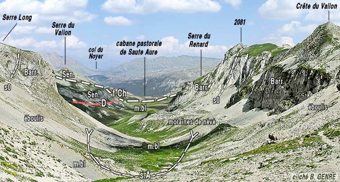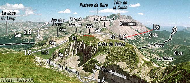 ![]() Le vallon des Aiguilles, vu de l'est, depuis la Tête du Jas des Ares. a.B (en rose) = anticlinal N-S de la Béoux, à plongement vers le nord (voir la page "Haute Béoux") ; D.s = surface de discordance du Sénonien (enroulée par le ploiement anticlinal) ; s.A (en jaune-kaki) = synclinal des Aiguilles (on a figuré la torsion de son axe par l'anticlinal de la Béoux) ; f.Ch = faille verticale du Chauvet ; f.sV = faille du Serre du Vallon (prolongement méridional de la faille de la Barre des Fontaines des pentes orientales du Grand Ferrand). Sén.rub. = lauzes rubanées, en petits bancs ; Sén.sil. = Lauzes à silex ; Sén.sup. = Sénonien tout-à-fait supérieur (à gros bancs calcaires). Noter la lame de brèche de faille visible en avant-plan : elle jalonne le tracé de la faille du Chauvet. |