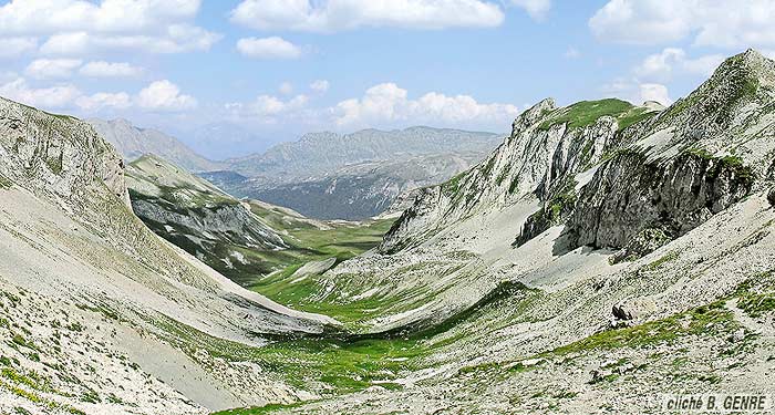 Vers l'est, en aval de la Fontaine du Roy, le vallon s'ouvre largement et se garnit d'alpages ("les Prés du col"). Le large aplanissement de son fond est visiblement dû aux divagations torrentielles qui y ont étalé leurs épandages. Mais on voit, sur ses deux flancs, pointer leur substratum de marnes bleues : en rive nord elles sont recouvertes en discordance par le Sénonien et en rive sud elles sont plaquées sur les dalles des calcaires barrémo-bédouliens dont l'orientation devient NW-SE. Ceci témoigne de la torsion de l'axe du synclinal, qui est le résultat de son reploiement par l'anticlinal N-S, post-Sénonien, de la Béoux.