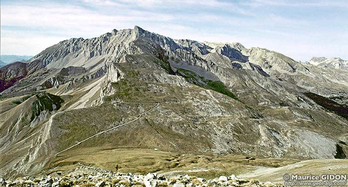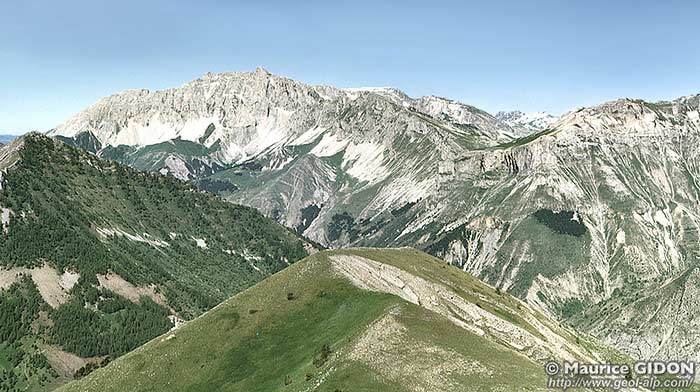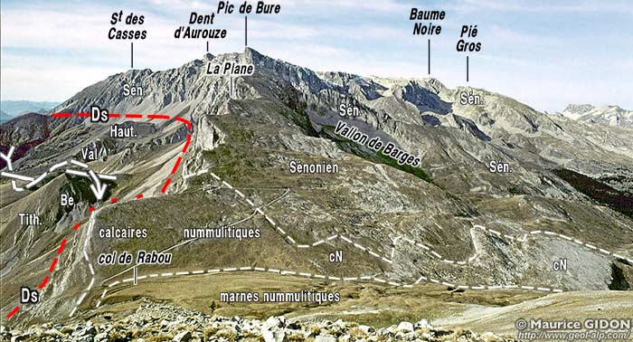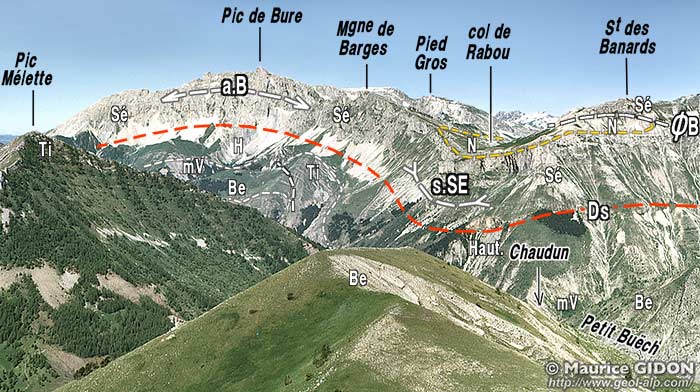 ![]() Les abrupts méridionaux du Dévoluy vus du sud-est, depuis le Pic de Gleize. Ds = surface de discordance de la base du Sénonien ; a.B = anticlinal NW-SE de Bure ; s.SE = synclinal de Saint-Étienne ; ØB = chevauchement des Banards (voir la page "Raz de Bec"). |