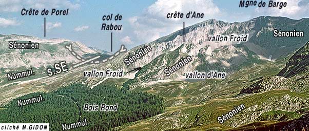 Les complications structurales qui affectent le soubassement du Sénonien ne sont évidemment pas perceptibles au nord de la crête E-W de la montagne de Barges et du col de Rabou où n'affleurent que le Sénonien et le Tertiaire. Par contre elles sont assez largement visibles dans le versant sud de la montagne où elles y ont été mises à nu par la profonde érosion du cours amont du Petit Buëch et de ses ravines affluentes.