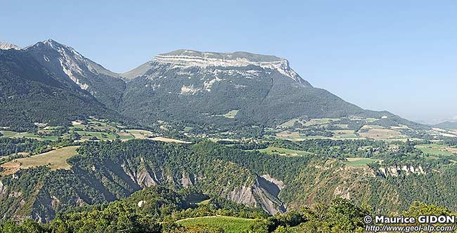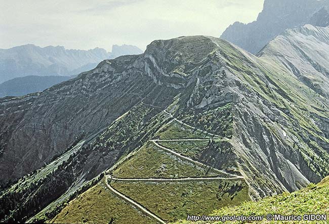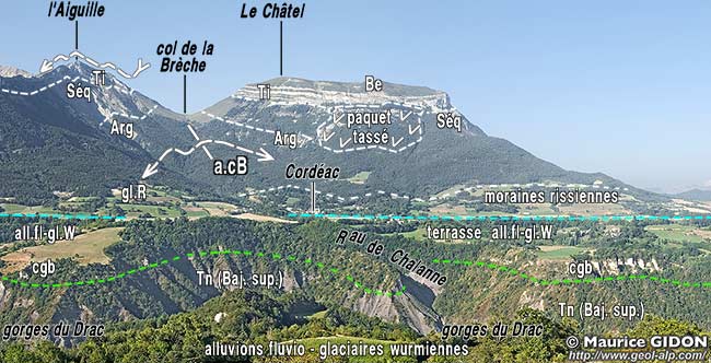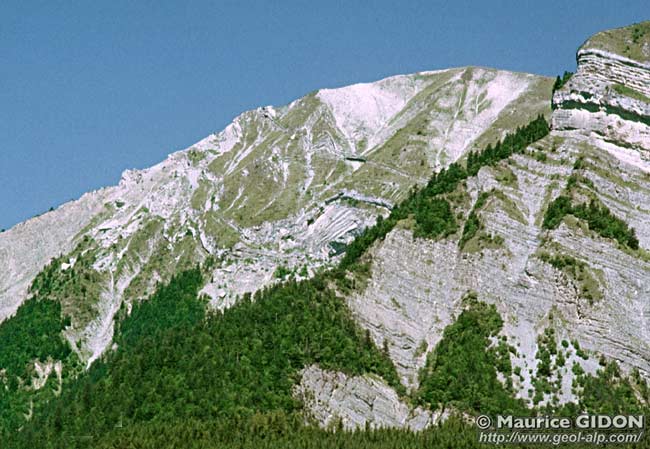 L'axe du pli passe dans les Terres Noires à Cordéac puis, en rive droite du Drac, sa voûte est dessinée par les calcaires du Lias moyen (c'est l'anticlinal du Chauvet, décrit à la page "Beaumont septentrional"). A l'opposé du relief inversé du col de la Brèche, les couches y sont au contraire dénudés par l'érosion et forment au Chauvet un relief très conforme, du type des monts jurassiens*. |