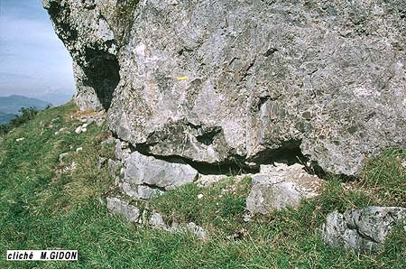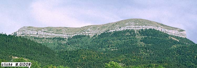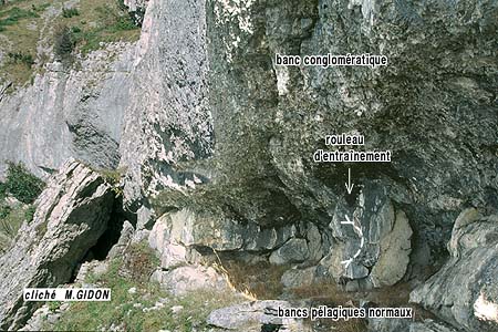 franchir les escarpements, un peu plus au nord que le cliché précédent. La base du gros bancs repose ici sur des bancs pélagiques normaux qui ont été rebroussés et renversés par le passage de la boue caillouteuse. La disposition du rouleau ainsi formé indique le sens de déplacement de la coulée de cailloutis : elle venait de droite, c'est-à-dire sensiblement d'est en ouest. |