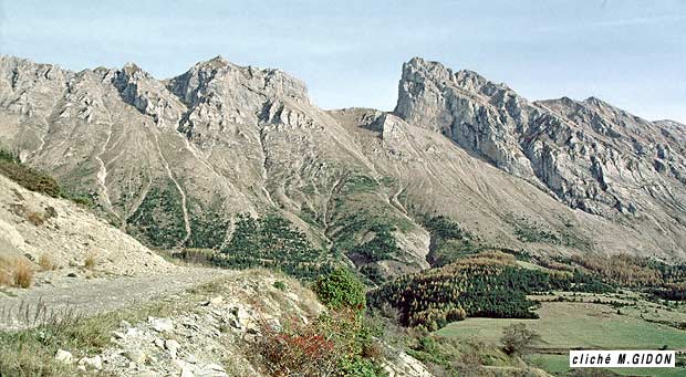 ![]() Le versant occidental de la crête de Faraut (partie moyenne), vu de l'ouest, depuis la route pastorale des Queyras, sur l'échine du même nom (à la voûte de l'anticlinal du Gicon). Les couches du Sénonien du flanc oriental du synclinal
